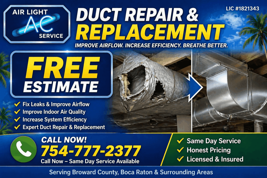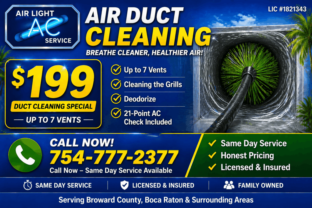 Air Light AC Service provides professional AC repair, air conditioning installation, HVAC maintenance, and air duct cleaning in Boca Raton, Parkland, Deerfield Beach, Pompano Beach, Fort Lauderdale, Hollywood, Wilton Manors, Coral Springs, Margate, Coconut Creek, and surrounding Broward County and South Florida with reliable HVAC Repair and Air duct cleaning services.